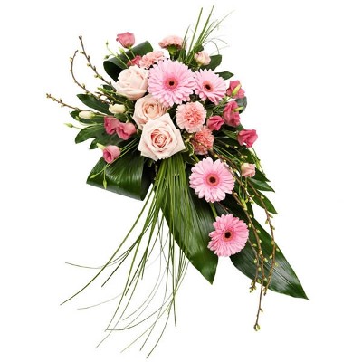 Dit rouwarrangement bevat doorgaans bloemen zoals rozen, mini-gerbera’s, lisianthus, anjers en seizoensbladgroen. Een mooie manier om uw liefde uit te drukken.