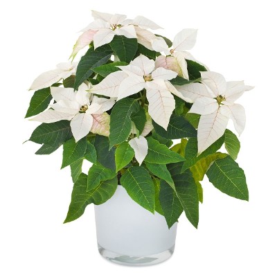 Cette magnifique plante de poinsettia blanche, également appelée étoile de Noël, est le cadeau parfait pour surprendre quelqu'un à Noël. Livrée dans un pot blanc assorti.