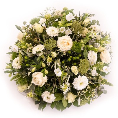 Des roses blanches classiques, des gerberas, des alstromerias, des œillets et d'autres fleurs composent cet hommage polyvalent aux couleurs élégantes et traditionnelles. Un geste de souvenir affectueux ainsi que de réconfort et de soutien pour les personnes en deuil de votre proche.