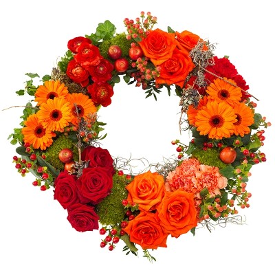 Une couronne funéraire ronde chaleureuse et rayonnante de couleur rouge et orange, confectionnée de manière experte. Elle présente un mélange de de roses, d'œillets, de gerberas, de renoncules et des feuillages verts. Pour un prix très compétitif, c'est un rappel gracieux de votre compassion, créant un hommage sincère qui célèbre les souvenirs précieux.