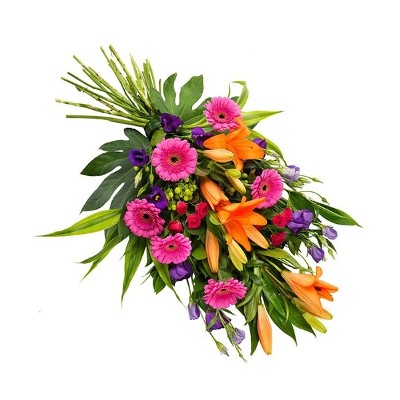 Lorsque les mots sont impuissants. Accompagnez vos condoléances de cette superbe gerbe funéraire. Elle se compose de fleurs telles que le lys, le germini, le lisianthus, la rose ou l'hypericum, rehaussées de feuillages de saison.